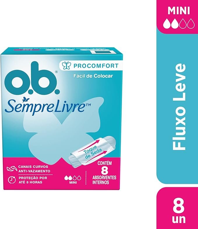 Outro nome entre os melhores absorventes de 2025 é o o.b. Absorvente Interno Mini Pro Comfort, indicado para quem busca discrição, liberdade de movimento e conforto mesmo nos primeiros dias do ciclo. Ideal para mulheres com fluxo leve a moderado, seu formato pequeno e ponta cônica facilitam a colocação e tornam o uso prático e confortável desde o início.