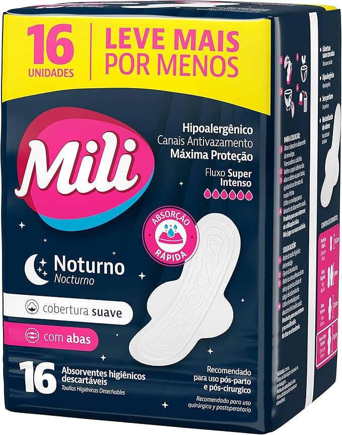 Com canais de fluxo que distribuem o líquido uniformemente e abas flexíveis para fixação segura, o Mili Noturno oferece máxima proteção contra vazamentos. Além disso, é hipoalergênico, dermatologicamente testado e conta com micropartículas que neutralizam odores, mantendo a sensação de frescor por horas. Uma opção prática, acessível e eficaz.