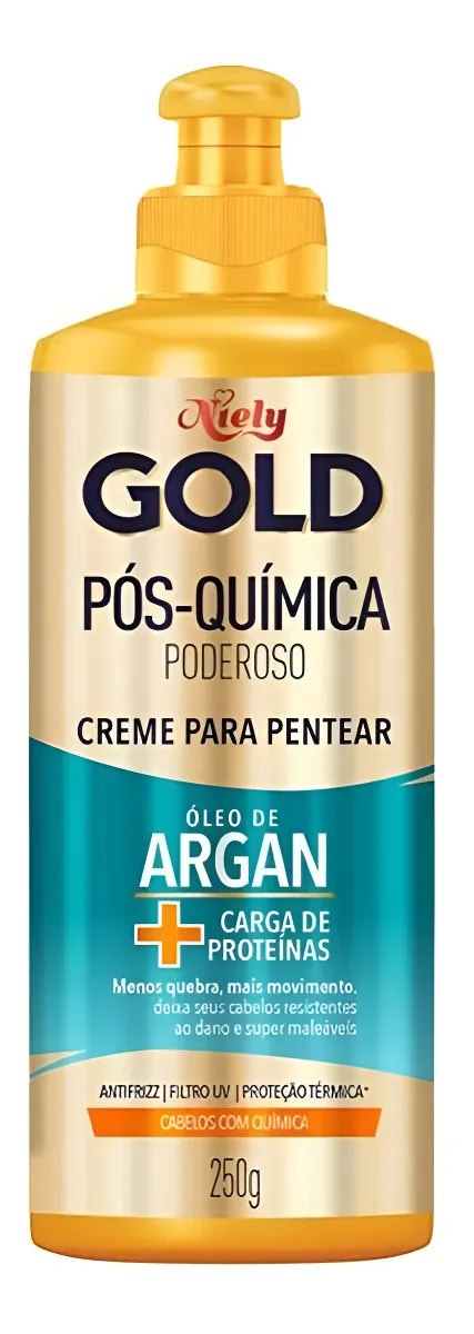 A Niely Gold é uma velha conhecida do público brasileiro, e seu Creme para Pentear Pós-Química com Óleo de Argan é ideal para quem tem cabelo liso quimicamente tratado e precisa de reforço na nutrição. Ele funciona especialmente para pessoas que lidam com ressecamento, pontas ásperas e perda de brilho após progressivas, colorações ou relaxamentos.