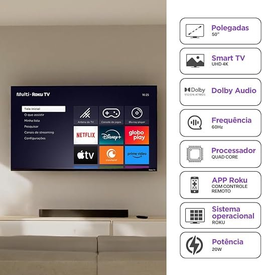 Apesar de não ser uma marca tão conhecida como as demais, a Smart TV 50″ Roku Multi 4K TL059M surpreende pelo conjunto equilibrado e recursos modernos para quem busca uma TV acessível. A tela DLED de 50″ com resolução 4K HDR entrega boas cores e nitidez, enquanto o sistema Roku garante navegação rápida, simples e repleta de aplicativos.