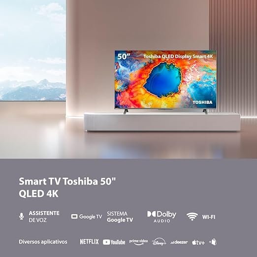 A Toshiba 50C450NS é uma opção certeira para quem busca a melhor TV de 50 polegadas com foco em imersão e praticidade no dia a dia. Indicada para usuários que valorizam uma experiência mais cinematográfica sem complicações, ela combina um painel QLED de alto nível com a fluidez do Google TV para quem navega entre apps, filmes e séries constantemente.