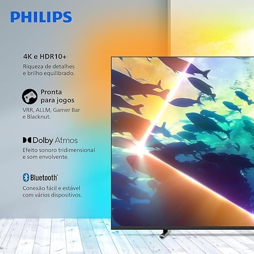 O painel LED com HDR10+ entrega cores vivas e bom nível de contraste, enquanto o processador Pixel Precise Ultra HD melhora movimentos e nitidez em cenas rápidas. Recursos como Dolby Atmos/DTS:X, Bluetooth Fast Pair, Alexa integrada e funções gamer (VRR, ALLM e Game Bar) completam a experiência com ótimo custo-benefício.